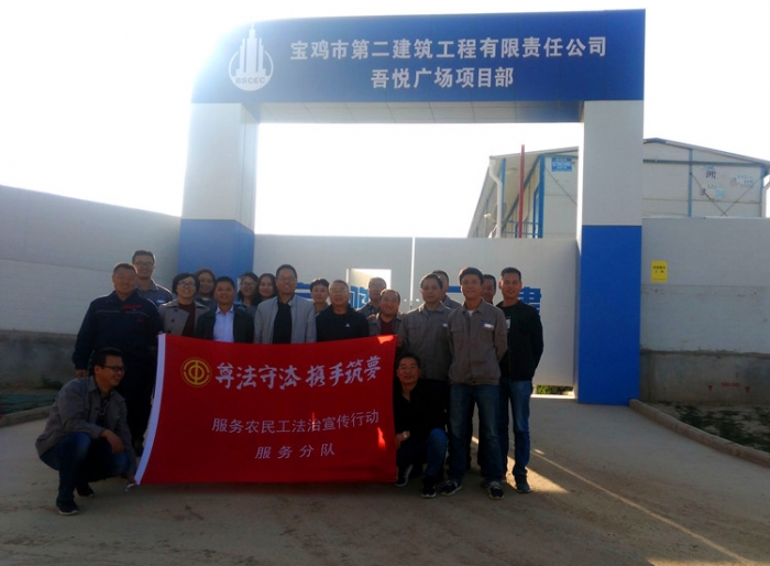 2018年10月10日下午,寶雞文理學院服務(wù)農(nóng)民工法治宣傳服務(wù)分隊來到公司吾悅廣場項目施工現(xiàn)場,舉辦了一場“尊法守法·攜手筑夢”法律知識公益講座。第三十項目部、第三十八項目部的三十余名現(xiàn)場施工人員參加了活動。
